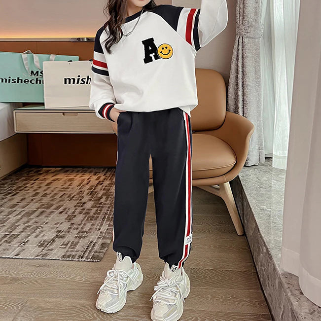 طقم بنطلون للبنات مكوّن من قطعتين مناسب للأعمار من 13 إلى 14 سنة بتصميم عملي وخامة مريحة للاستخدام اليومي يتميز بخامة مضلعة تمنح مرونة متوسطة وسهولة في الحركة