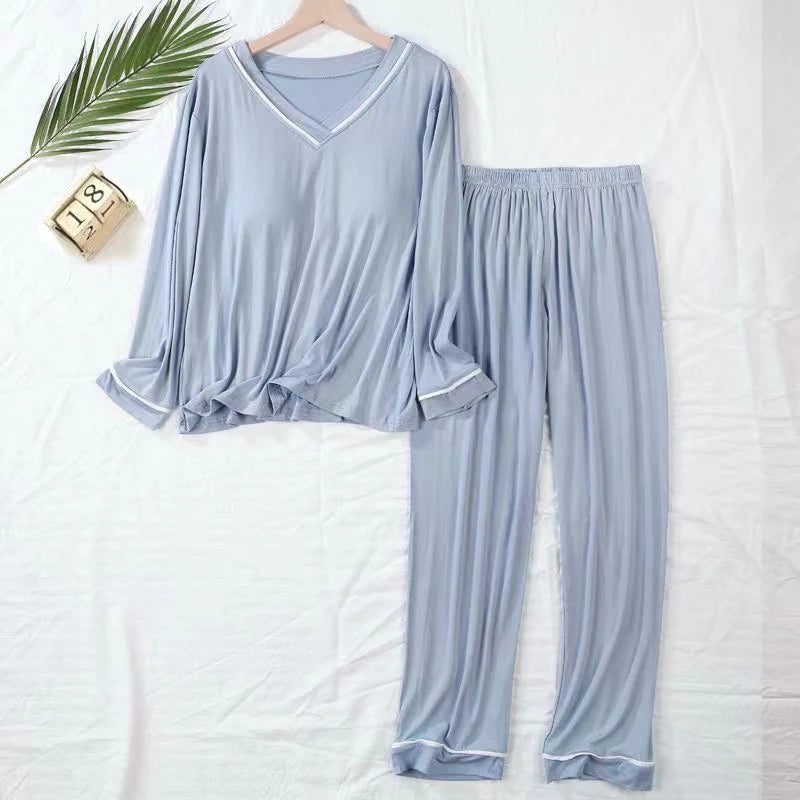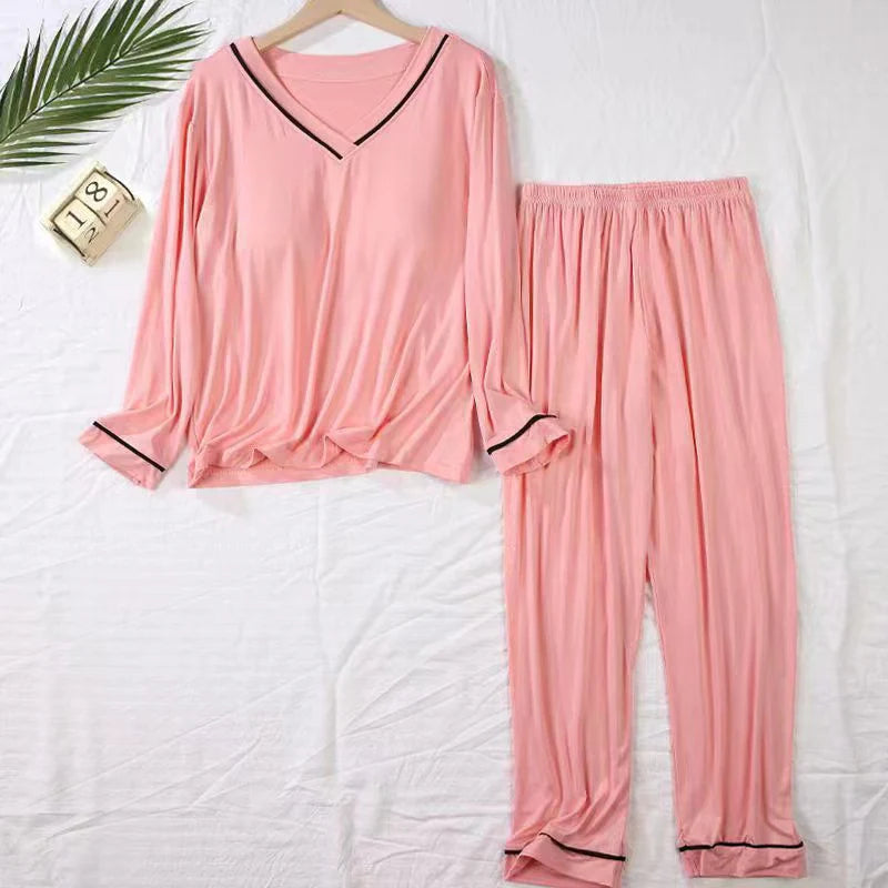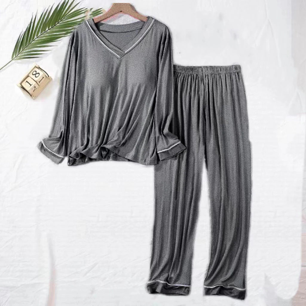 مجموعة نوم نسائية مكوّنة من قطعتين بتصميم أساسي وبسيط يمنح راحة مثالية للاستخدام داخل المنزل. تتميز بياقة على شكل V تضيف لمسة أنثوية ناعمة، مع أكمام طويلة وخامة منتصف مطاطا توفر توازنًا بين الراحة والثبات. خيار عملي لإطلالة منزلية هادئة وسهلة التنسيق بلون صامد