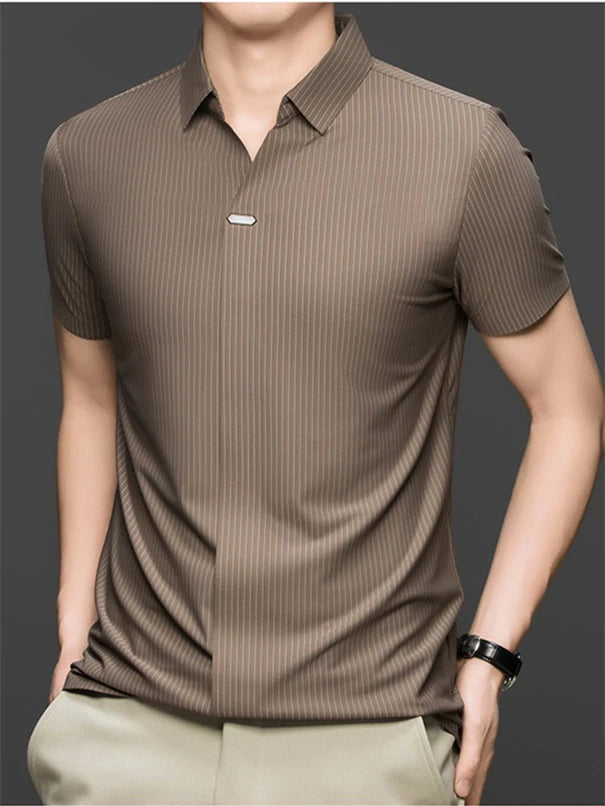 قميص بولو رجالي صيفي بتصميم عصري ورياضي، يوفر راحة مثالية طوال اليوم مع أكمام منتظمة وخامة منخفضة المرونة لتناسب الإطلالات اليومية والرياضية في فصل الصيف.