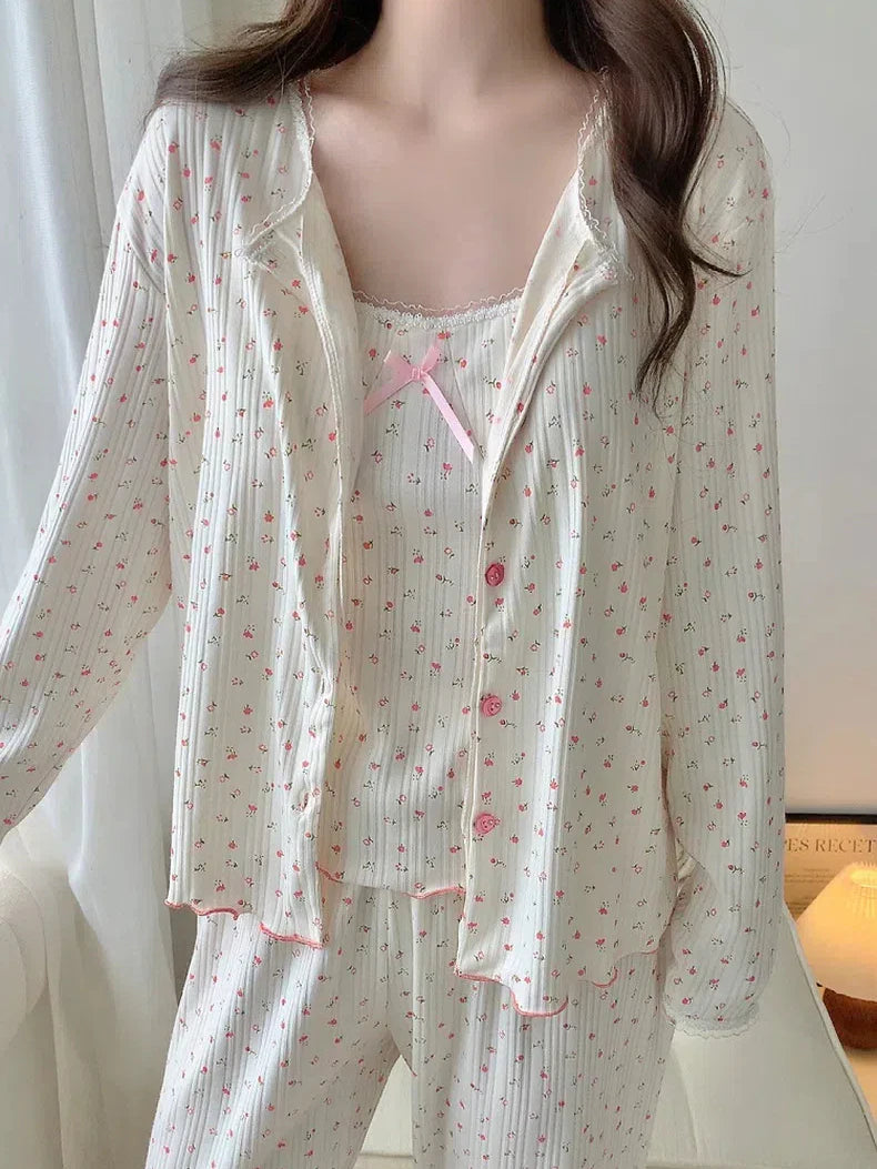 مجموعة نوم نسائية مكوّنة من 3 قطع بتصميم زهري أنيق ومريح، تمنح إطلالة مريحة داخل المنزل. تتميز بقصة طويلة للأكمام وياقة على شكل V تمنح راحة وأناقة في الوقت نفسه، مع خامة منتصف مطاطا توفر مرونة متوسطة للحركة. خيار مثالي للراحة اليومية والمساءات المنزلية