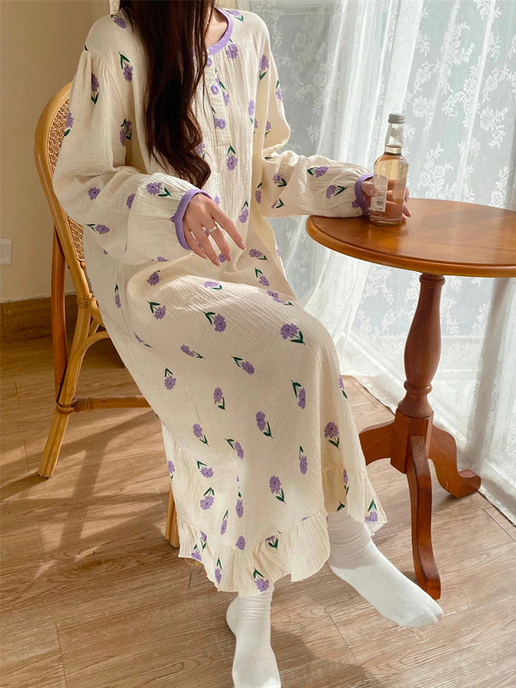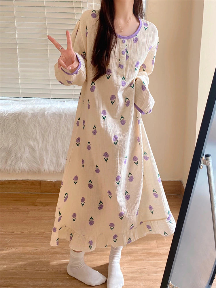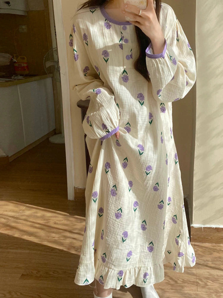 ثوب نوم نسائي بأكمام طويلة بتصميم لطيف يجمع بين النقشة الزهرية ولمسات الكرتون، ليمنح إطلالة مريحة وناعمة للاستخدام داخل المنزل. يتميز بياقة مستديرة كلاسيكية وخامة منتصف مطاطا توفر مرونة وراحة أثناء النوم والاسترخاء. خيار عملي ومناسب للأجواء اليومية المنزلية