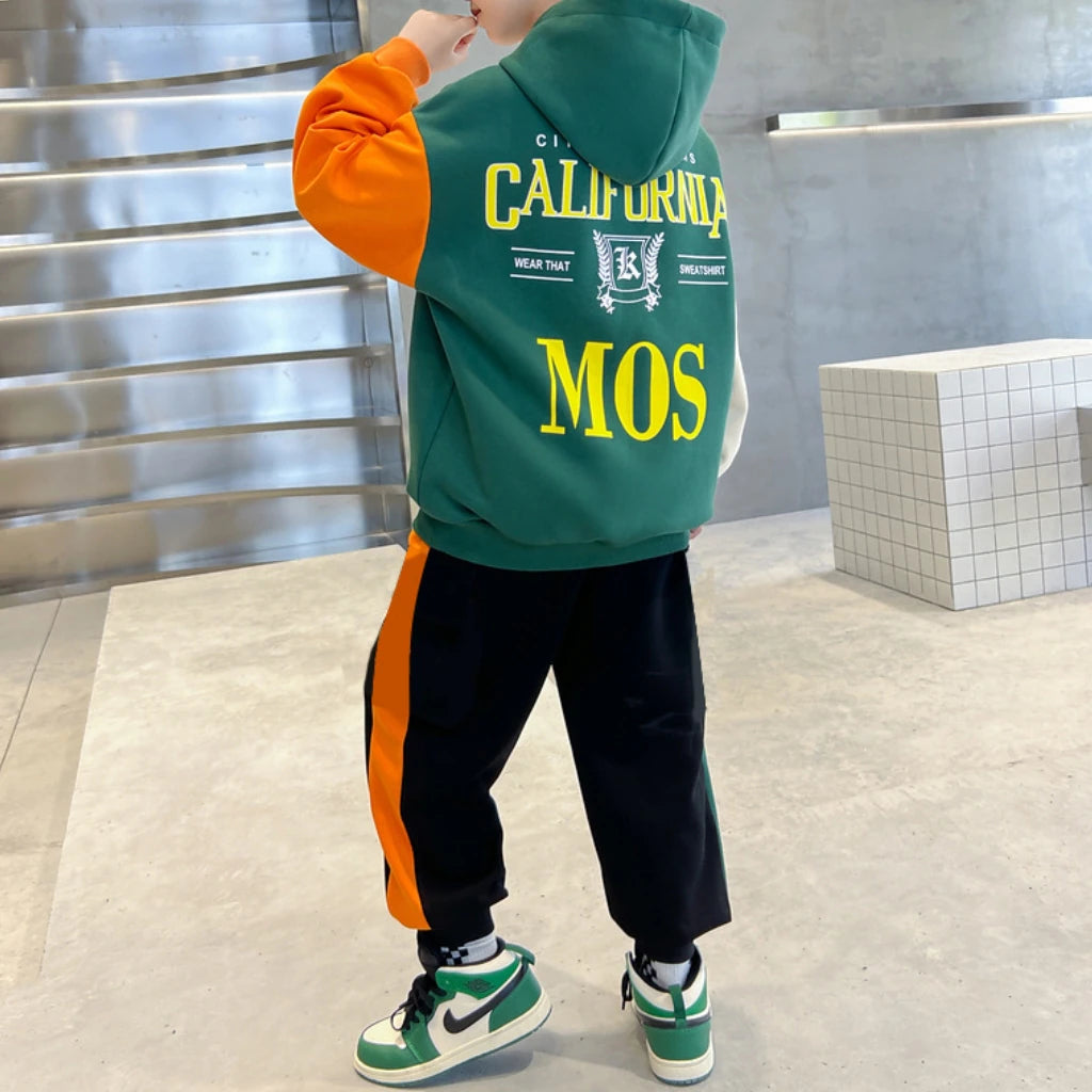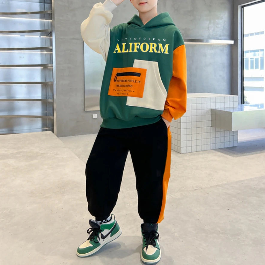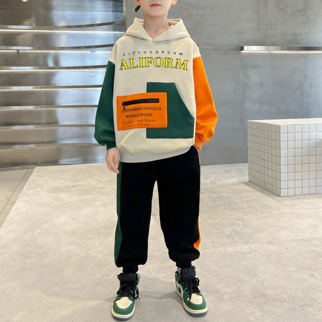 بدلة سروال مكونة من قطعتين للأولاد من عمر 4 إلى 13 سنة بتصميم عملي يناسب الأنشطة الرياضية والاستخدام اليومي. تتميز بقصة عادية توفر راحة أثناء الحركة، وخامة مناسبة للأطفال تضمن سهولة اللبس ومظهر مرتب طوال اليوم