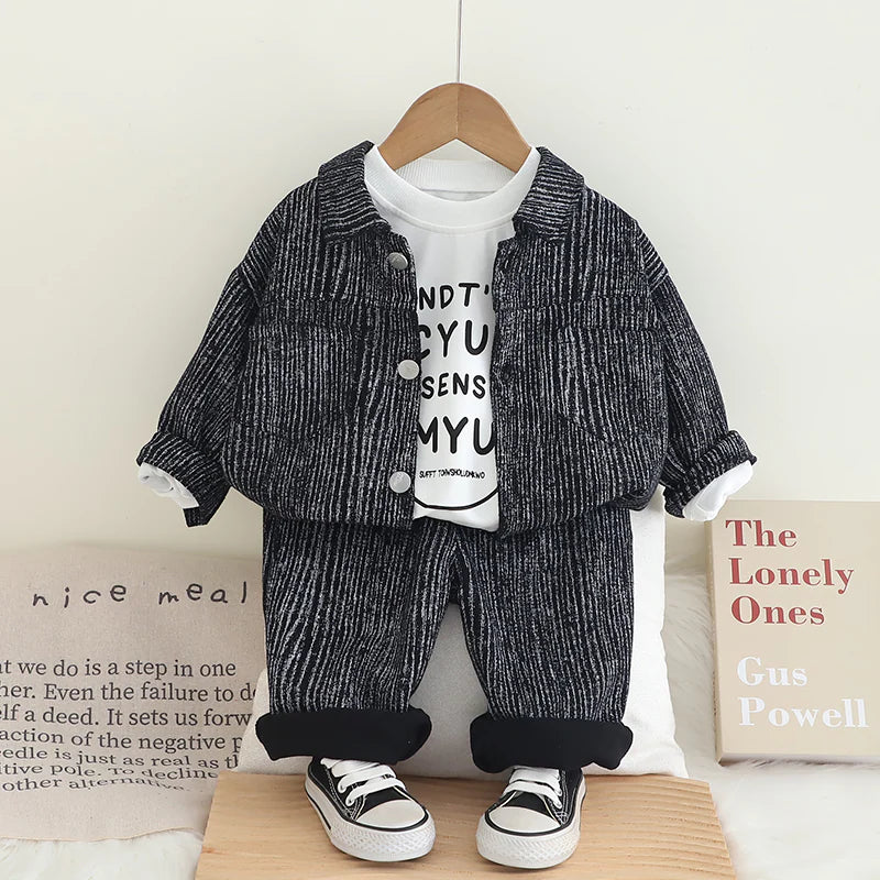 بدلة سروال أنيقة ومريحة للأولاد مكونة من 3 قطع، مناسبة للأطفال من عمر سنتين إلى خمس سنوات. تم تصميمها لتمنح الطفل راحة في الحركة ومظهراً عصرياً في نفس الوقت، مما يجعلها خياراً مثالياً للأنشطة الرياضية والاستخدام اليومي. خامتها مريحة وقصّتها عادية تناسب اللبس الطويل خلال اليوم