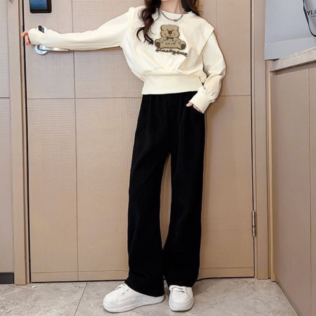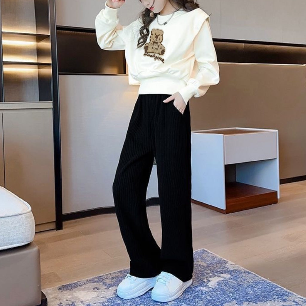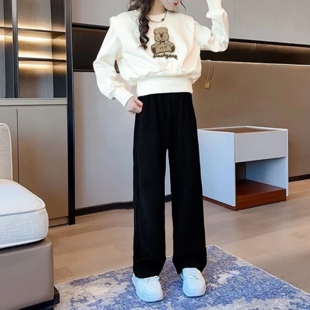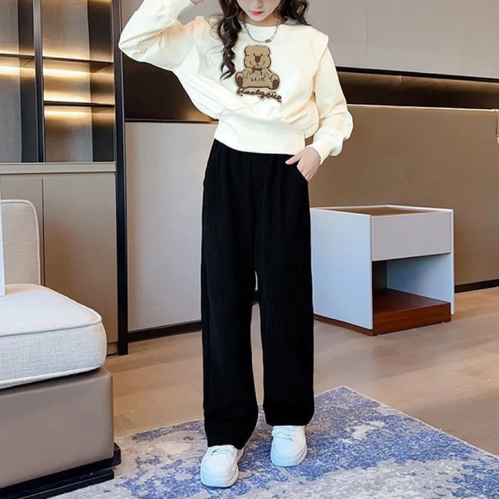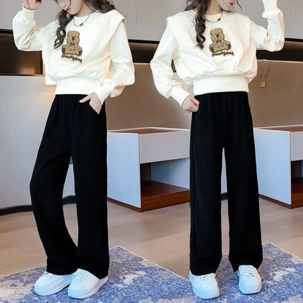 طقم بنطلون للبنات مكوّن من قطعتين، مناسب للأعمار من 4 إلى 13 سنة، بتصميم عملي وعصري يوفر راحة عالية أثناء الارتداء. يتميز بقصة فضفاضة تمنح حرية حركة مثالية، ليكون خيارًا مناسبًا للأنشطة اليومية والرياضية.