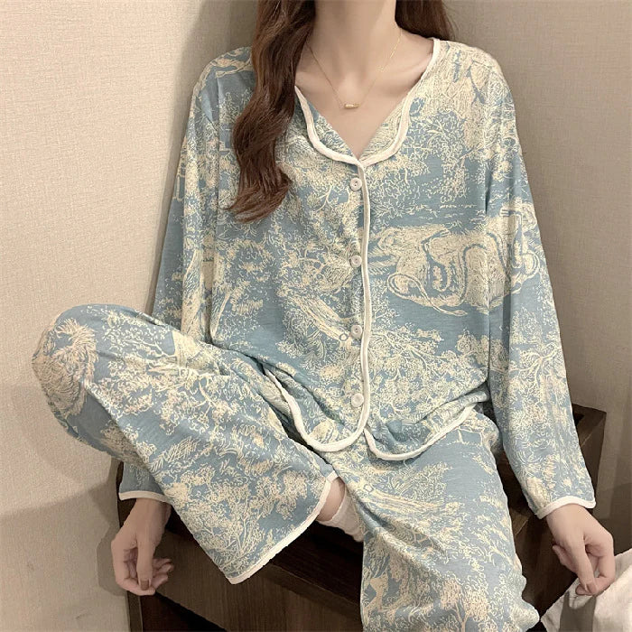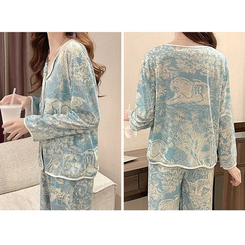 طقم نوم نسائي مكوّن من قطعتين بأكمام طويلة وياقة طوق القميص، يمنح راحة مثالية داخل المنزل. يتميز بنمط التدرج اللوني وخامة من أقمشة أخرى بمرونة منتصف مطاطا لتوفير توازن مثالي بين الثبات والراحة، مناسب لمختلف الفئات للاستخدام اليومي