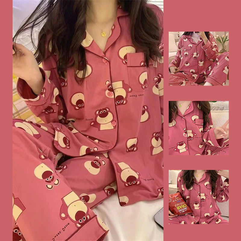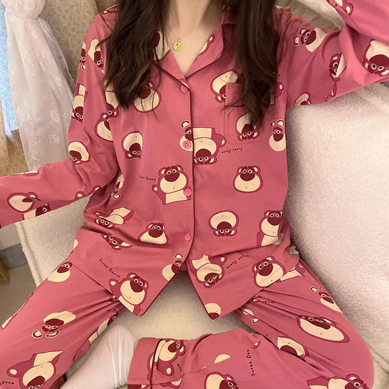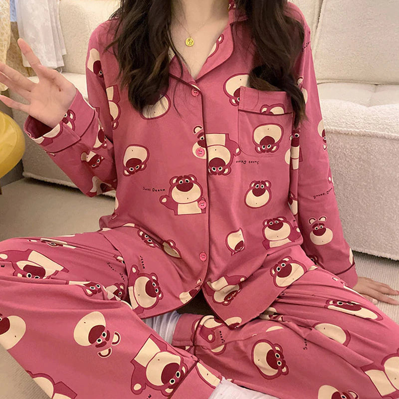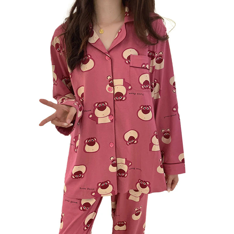 طقم نوم نسائي مكوّن من قطعتين بأكمام طويلة وياقة بولو، يوفر راحة مثالية داخل المنزل. يتميز بنمط كارتون وخامة بمرونة منتصف مطاطا لتوازن مثالي بين الثبات والراحة، مناسب لمختلف الفئات العمرية للاستخدام اليومي