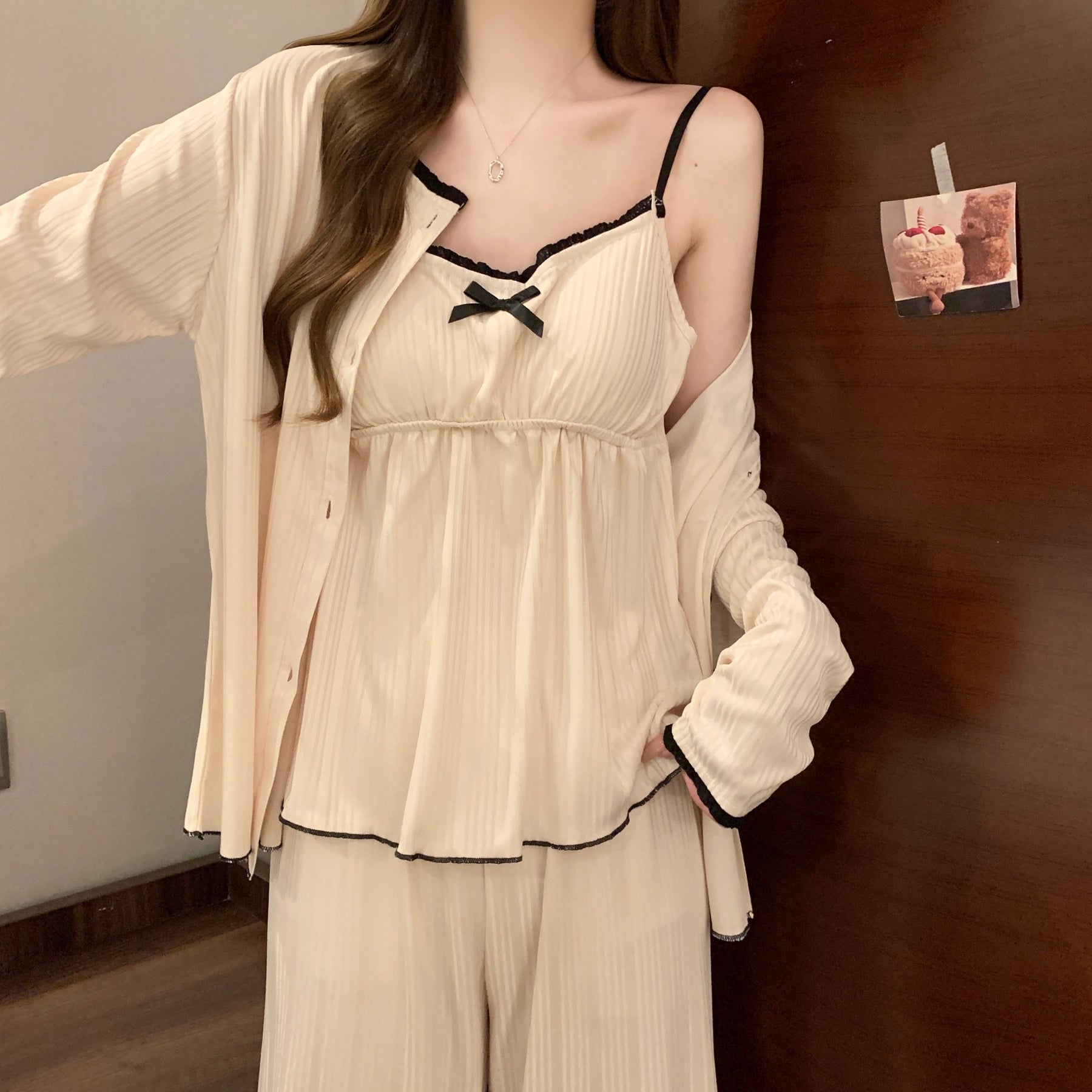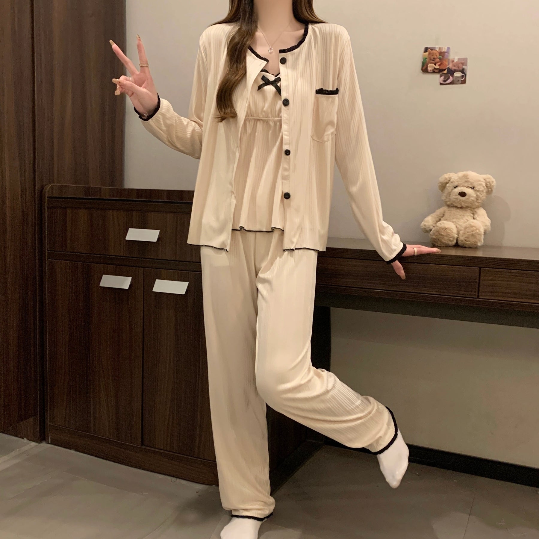 مجموعة نوم نسائية مكوّنة من ثلاث قطع بتصميم جذاب ولمسة رعوية ناعمة تمنح إحساسًا بالراحة والدفء داخل المنزل. تتميز بياقة مربعة عصرية وأكمام طويلة مناسبة لأوقات الاسترخاء، مع خامة قماش مضلع بارتفاع مرونة توفر نعومة ومرونة عالية أثناء الحركة. اختيار مثالي لإطلالة منزلية مريحة وأنيقة في الوقت نفسه