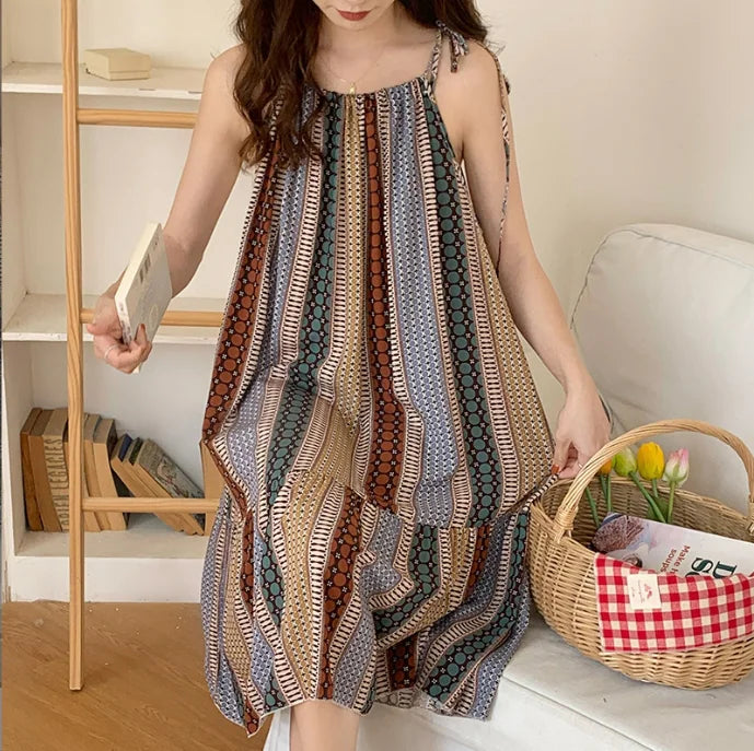 ثوب نوم نسائي بلا أكمام رقبة مستديرة شريط منقوشة هندسي مقاس واحد الطول سم: 95 الصدر سم: 74-100