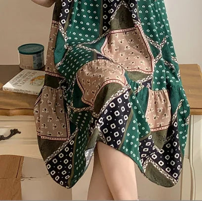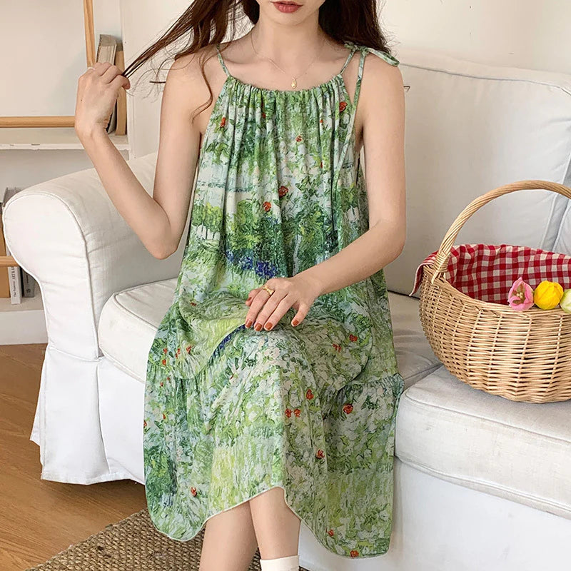 ثوب نوم نسائي بلا أكمام رقبة مستديرة شريط منقوشة أخضر مقاس واحد الطول سم: 95 الصدر سم: 74-100