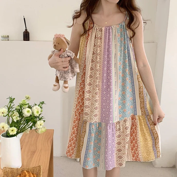 ثوب نوم نسائي بلا أكمام رقبة مستديرة شريط منقوشة متعدد الألوان مقاس واحد الطول سم: 95 الصدر سم: 74-100