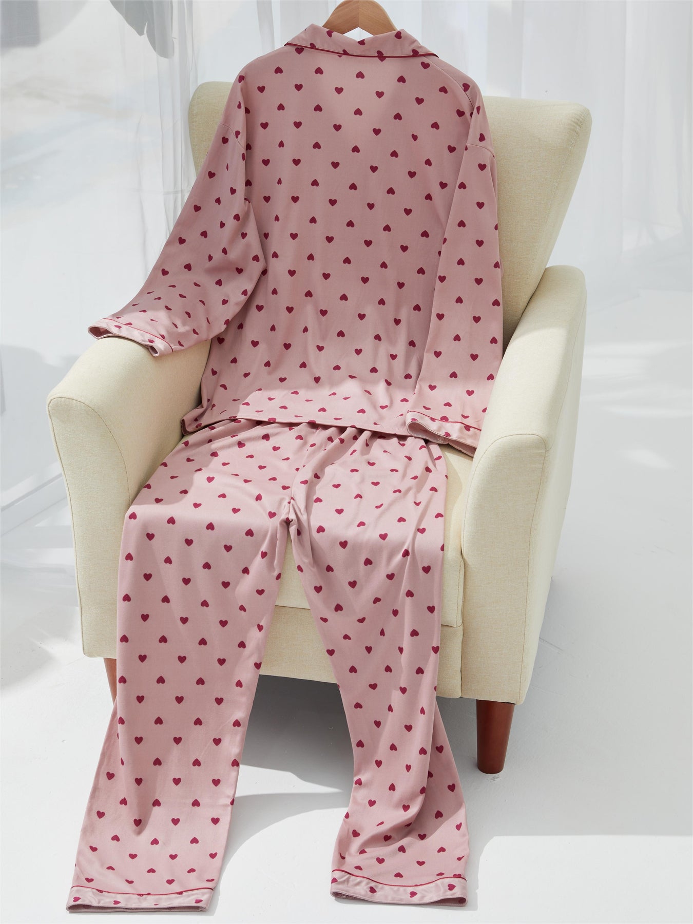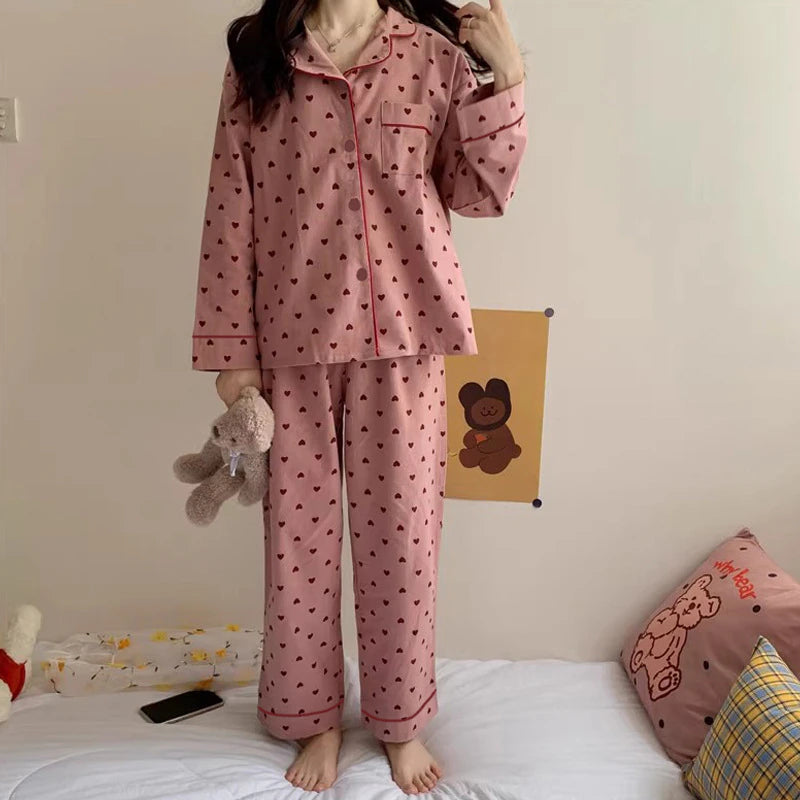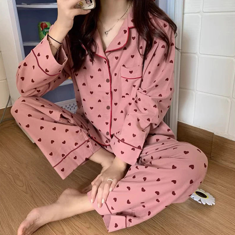 طقم نوم نسائي مكوّن من قطعتين بتصميم لطيف ومريح، يتميز بياقة بولو وأكمام طويلة تمنح مظهرًا أنيقًا وعمليًا داخل المنزل. يأتي بنمط شكل القلب الذي يضفي لمسة أنثوية ناعمة، مع خامة منخفضة المرونة تحافظ على ثبات الشكل وتوفر راحة مناسبة أثناء الاستخدام اليومي