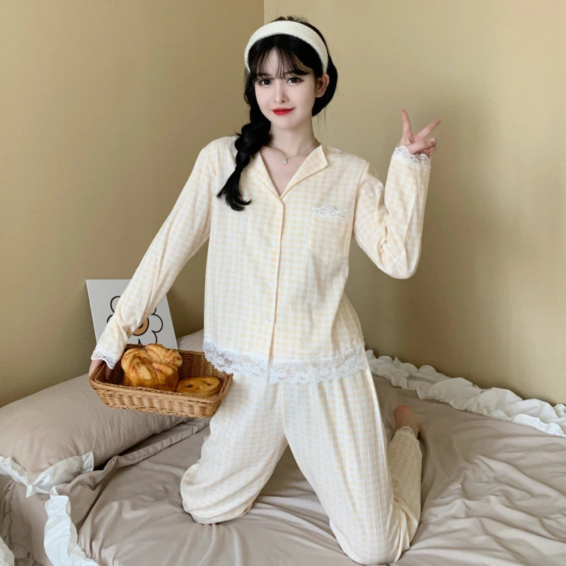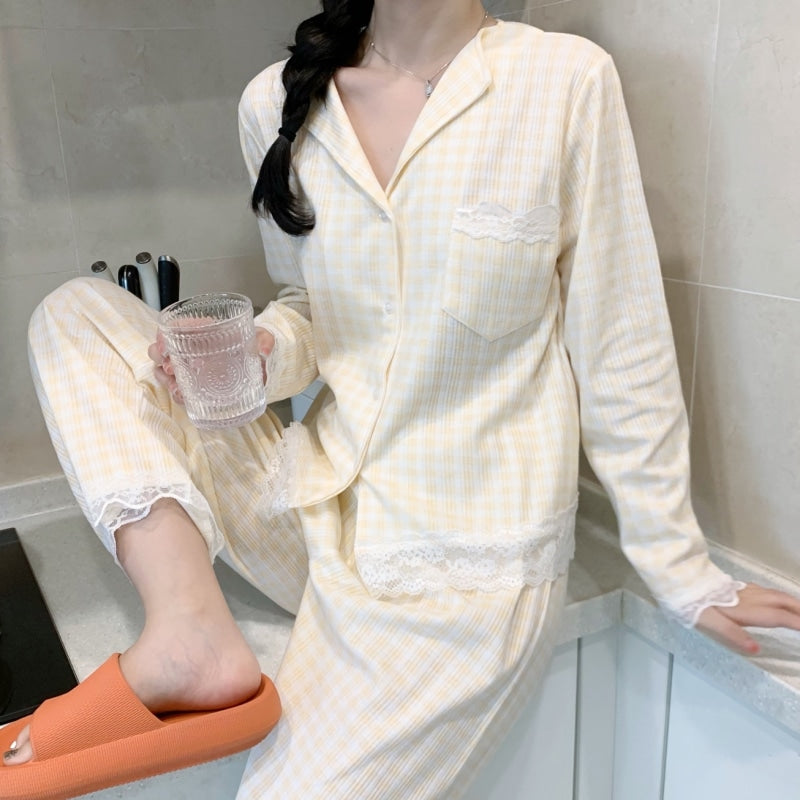 طقم نوم نسائي 2 قطع كم طويل لون صامد أصفر1