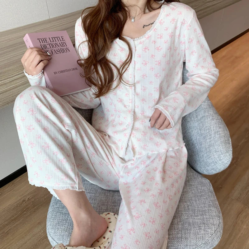 طقم نوم نسائي 2 قطع كم طويل لون صامد وردي فيونكة زهري