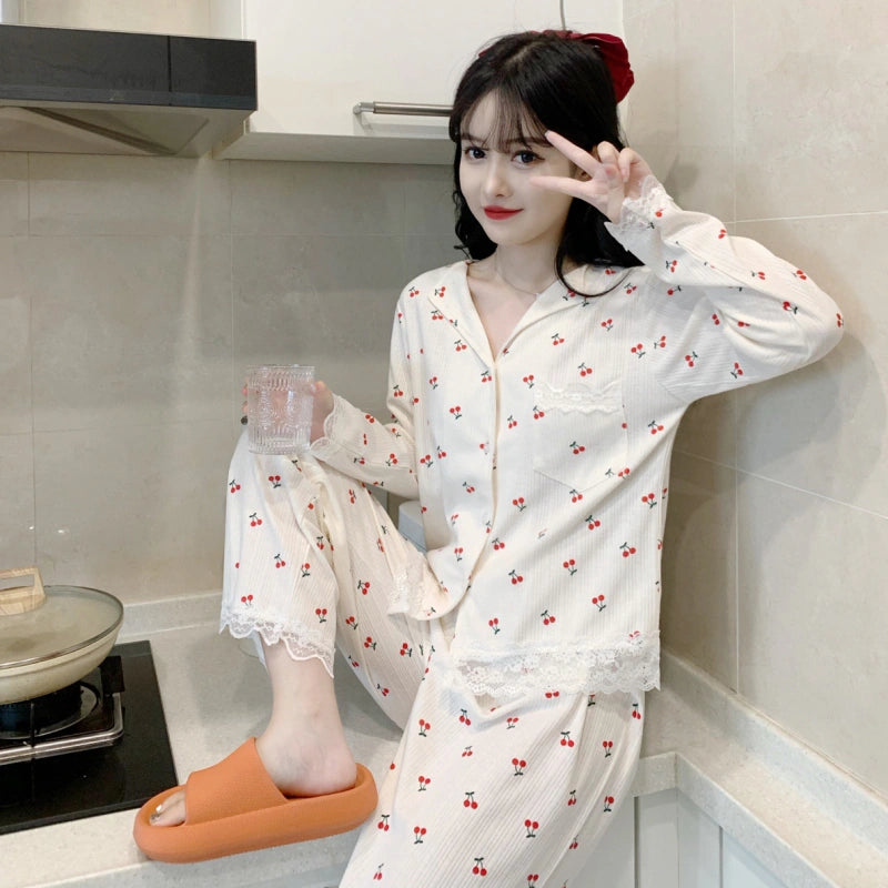 طقم نوم نسائي 2 قطع كم طويل لون صامد قلب أحمر