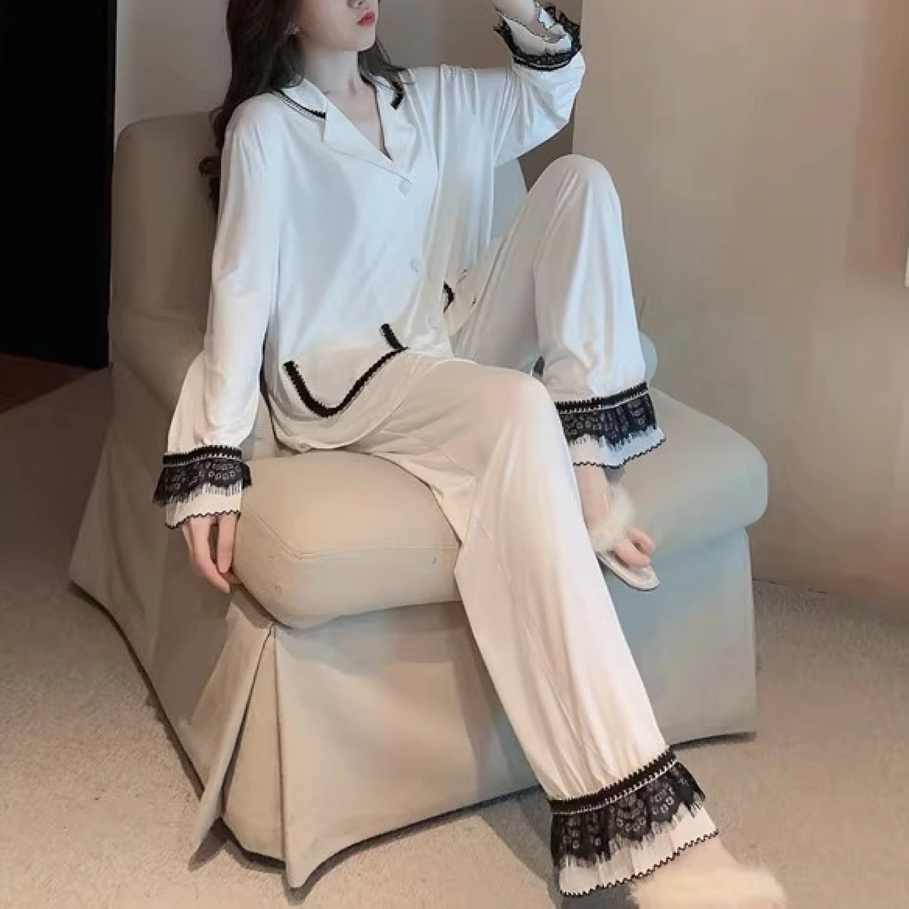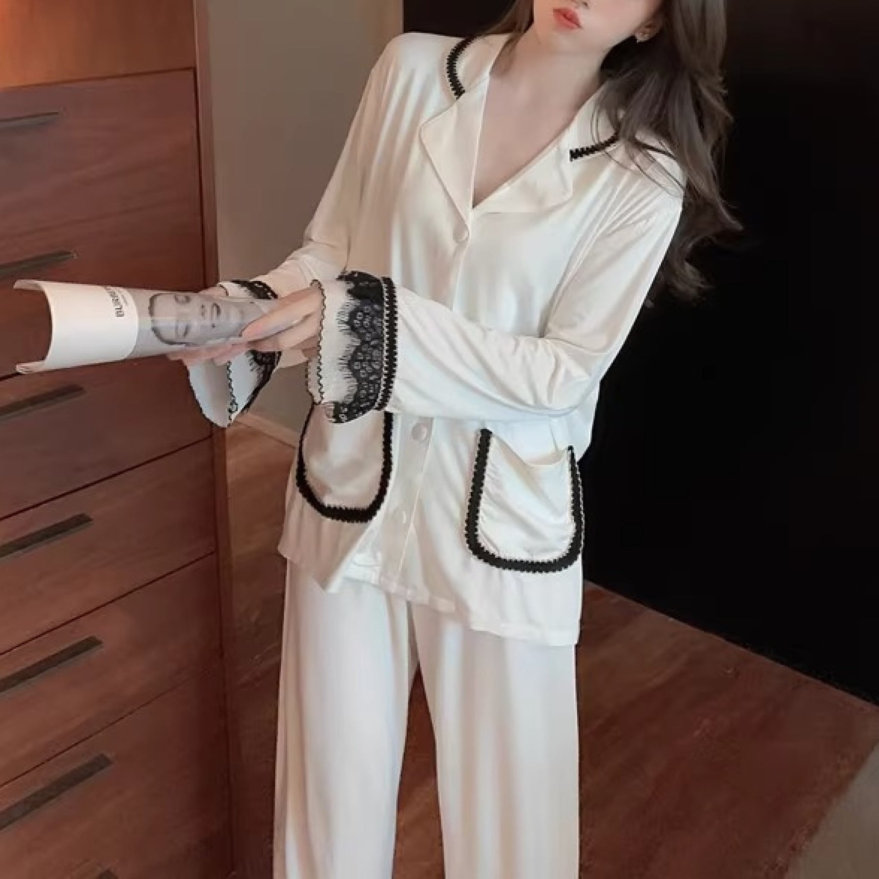 طقم نوم نسائي مكوّن من قطعتين بتصميم أنيق ومريح، يتميز بياقة على شكل V وأكمام طويلة ليمنح راحة مثالية داخل المنزل. يأتي بنمط اللون الصامد وخامة من أقمشة أخرى بمرونة منتصف مطاطا توفر توازنًا بين الثبات والمرونة، مناسب لمختلف الفئات العمرية للاستخدام اليومي الهادئ
