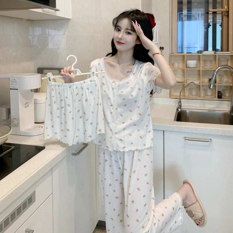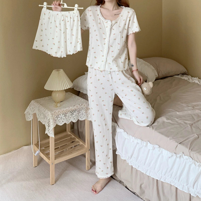 مجموعة نوم نسائية 3 قطع كم قصير زهري