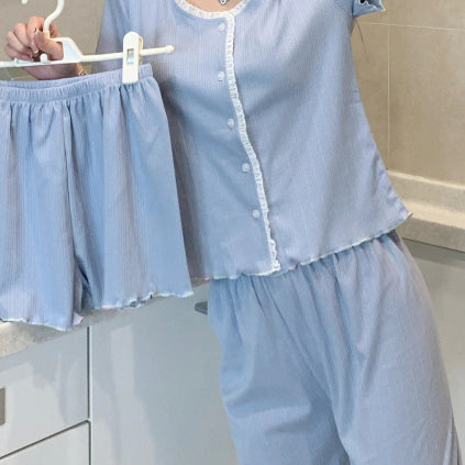 مجموعة نوم نسائية 3 قطع كم قصير زهري سماوي