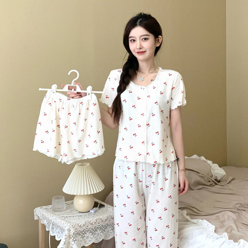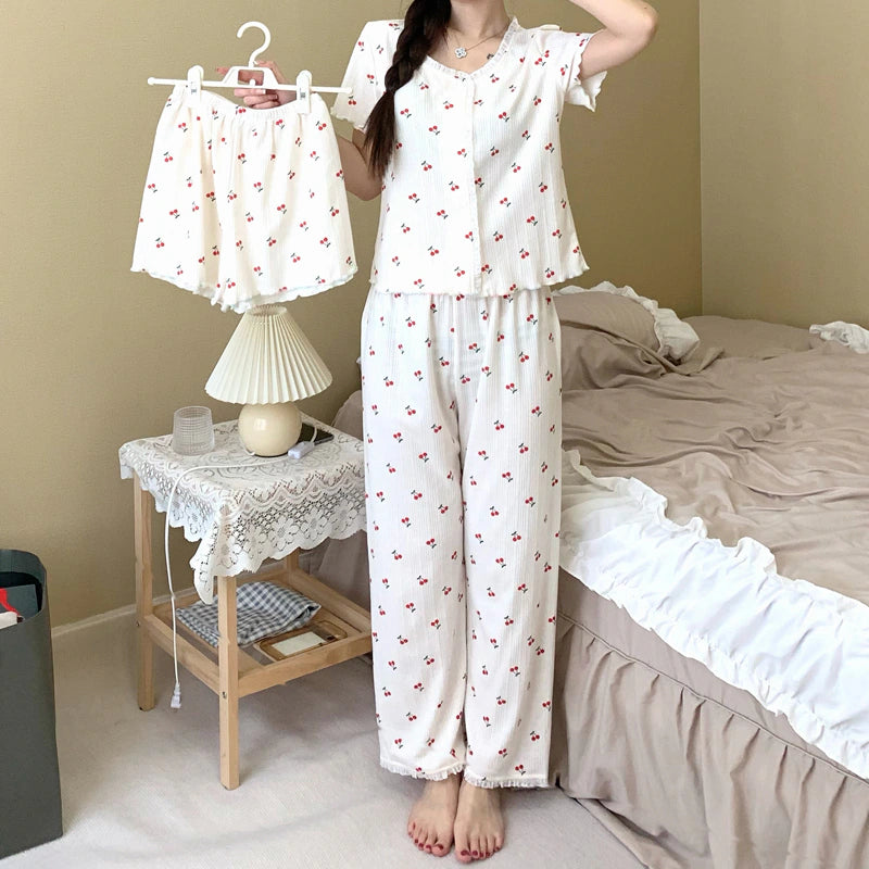 مجموعة نوم نسائية 3 قطع كم قصير زهري كرز
