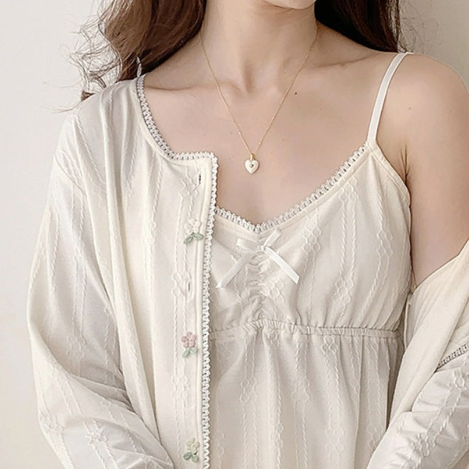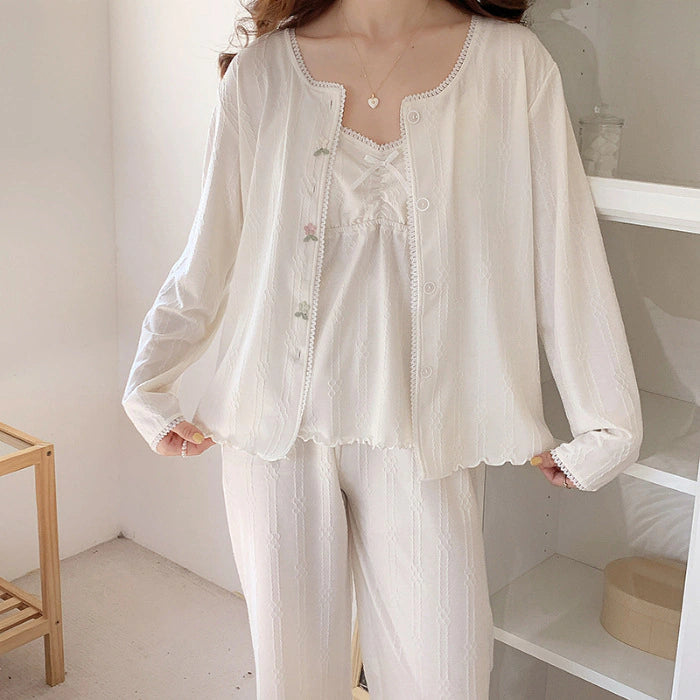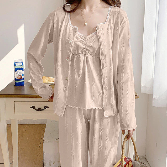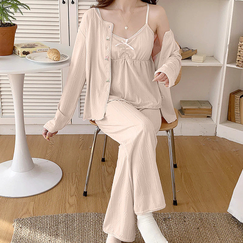 طقم ملابس مريحة نسائي مكوّن من ثلاث قطع بتصميم عملي وأنيق في نفس الوقت، مزوّد بياقة على شكل V تمنح لمسة أنثوية جذابة مع راحة مثالية للاستخدام داخل المنزل. يتميز بأكمام طويلة ونمط اللون الصامد مع تفاصيل بكلة الشعر (ببيونة) التي تضيف لمسة لطيفة وناعمة. خامته المرنة بمرونة متوسطة توفر حرية حركة وراحة طوال اليوم